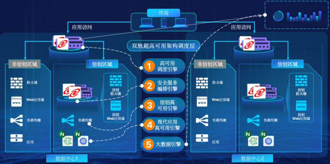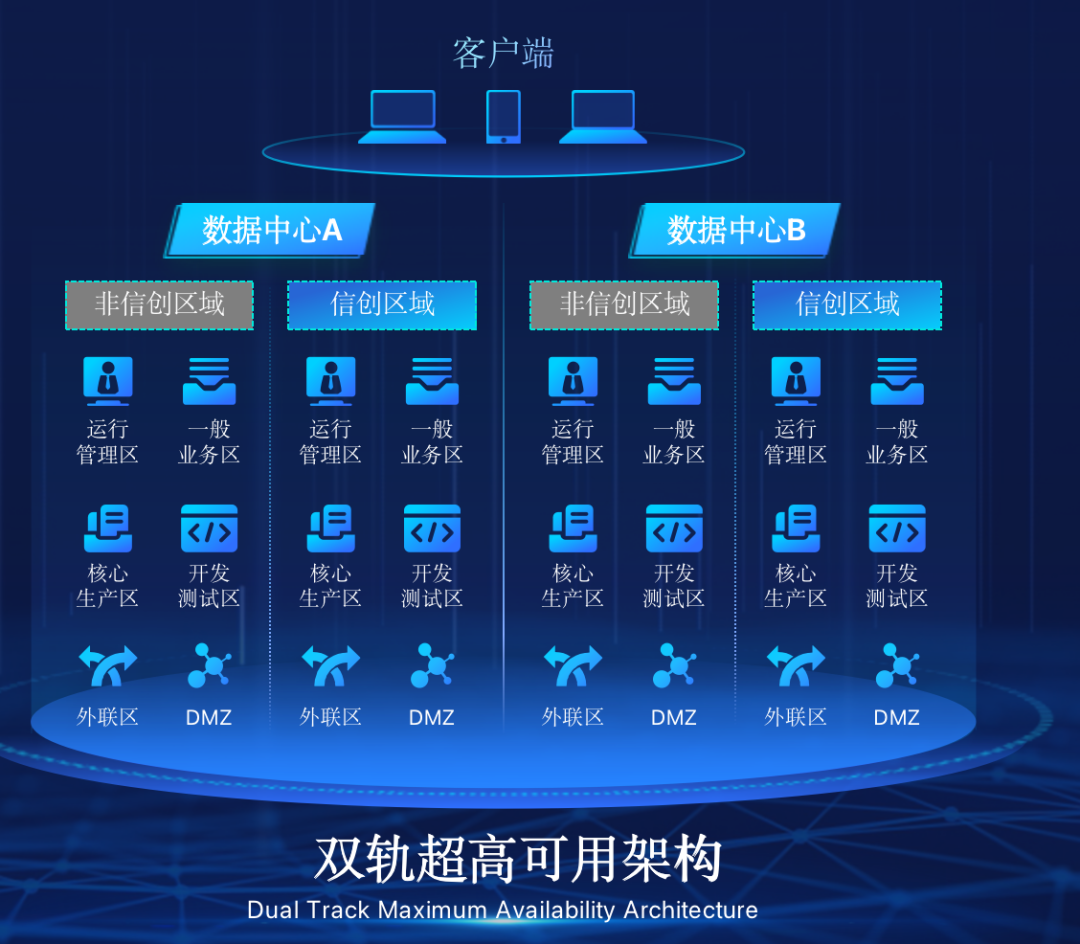 神州米兰在企业面临自主创新IT基础重构过程中,推出的全新架构双轨超高可用架构(简称DTMAA),在双活数据中心的分区调度基础上,添加每个数据中心内信创域和非信创域的分域调度,来实现分区分域协同的多活双轨超高可用。