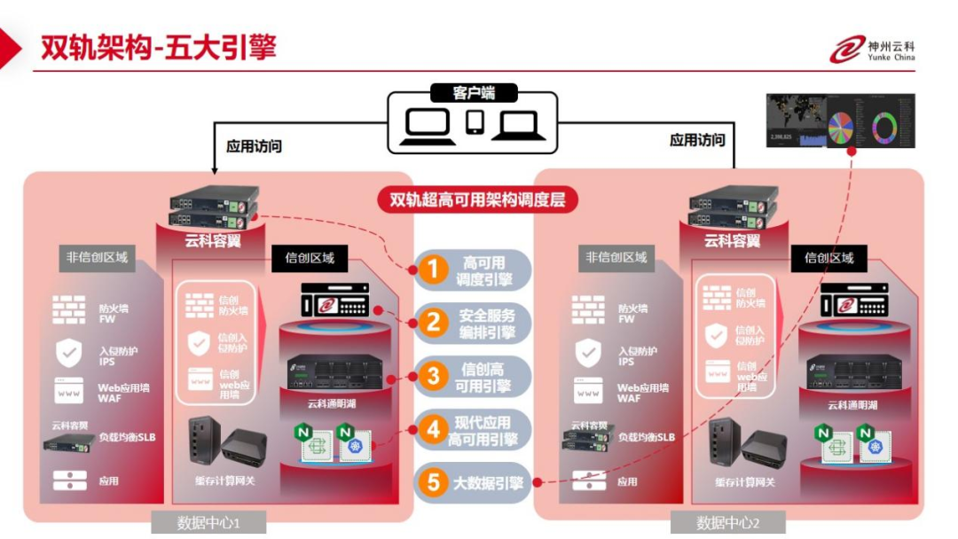数据中心架构在自主创新的过程中分解为现有架构的非信创区和信创区的两个业务区域,在每个数据中心分为信创区和非信创区后,在两个区域之间的跨区跨域协同方法,神州米兰通过5大引擎实现多层次的应用可持续性实践。